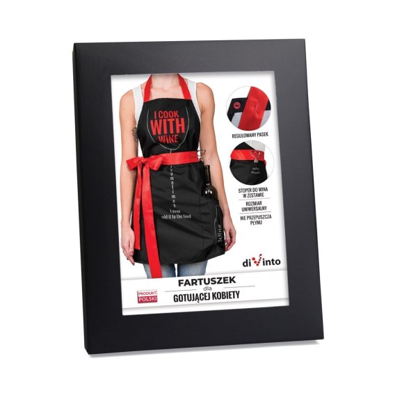 Gotowy do wręczenia na prezent bez konieczności dodatkowego pakowania. Napis na produkcie: I cook with wine. Sometimes I even add it to the food. Produkt w angielskiej wersji językowej.