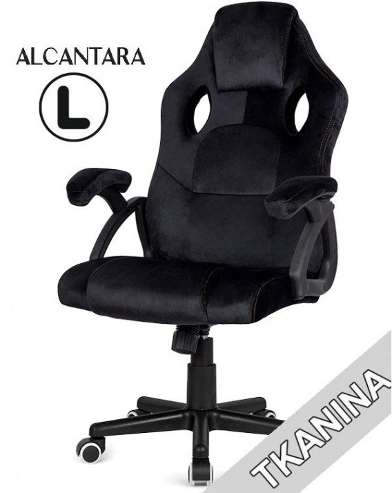 Fotel obrotowy do biurka, biura, dla gracza model CARRERA rozmiar L, wersja PRO, tapicerowany w całości czarną tkaniną- alcanatara, marki Lugano. Ergonomicznie wyprofilowane oparcie.