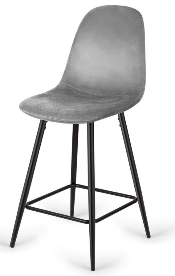 Krzesło barowe hoker, stalowe czarne nogi i szare welurowe siedzisko.