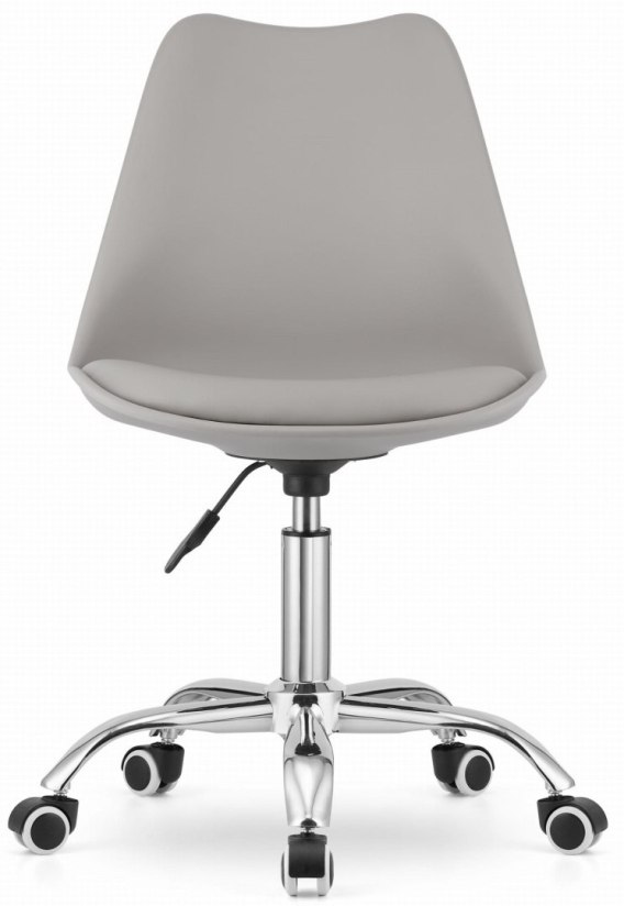 Nowoczesne krzesło obrotowe do biurka w kolorze jasnoszarym, z miękką poduszką siedziska i chromowaną podstawą.