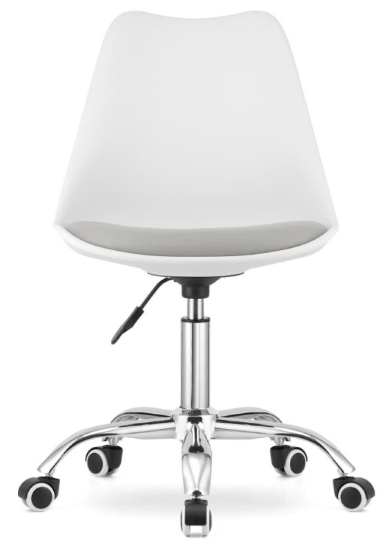Nowoczesne krzesło obrotowe do biurka w kolorze białym, z miękką poduszką siedziska i chromowaną podstawą.