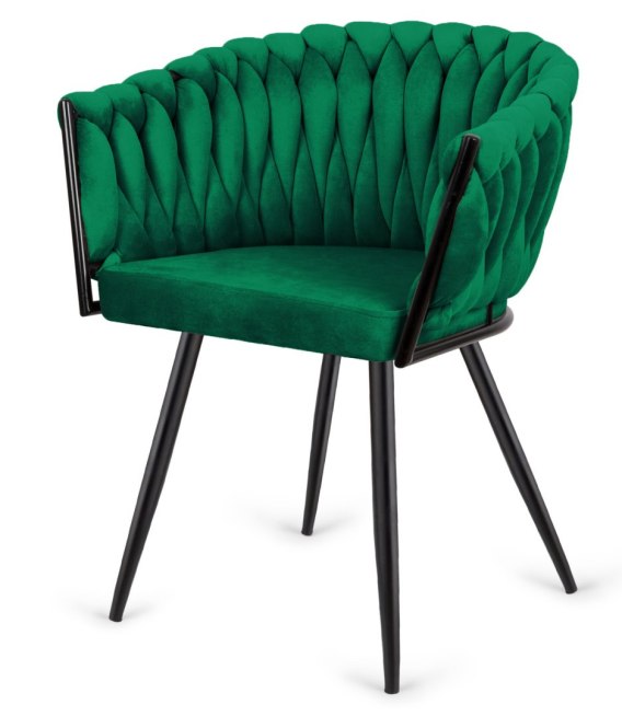 Stylowe i wygodne krzesło z plecionym oparciem, tapicerowane tkaniną welurową w kolorze zielonym.