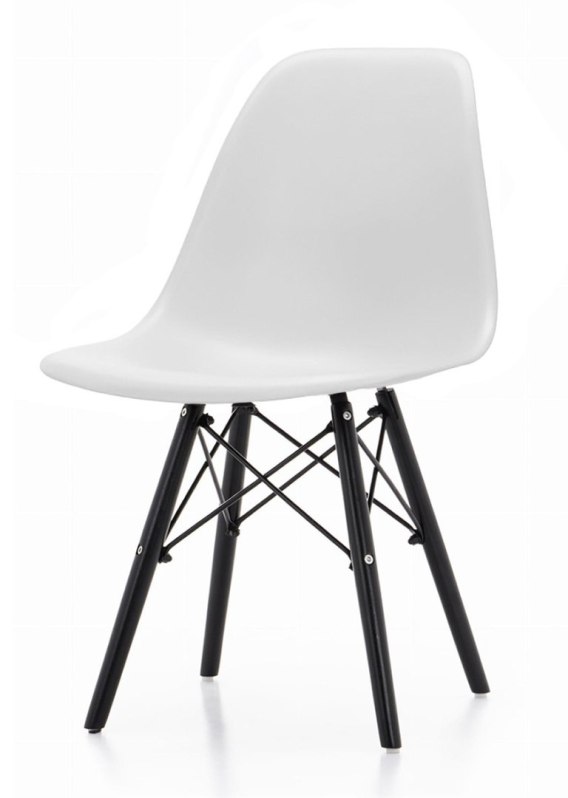 Nowoczesne krzesło w stylu skandynawskim marki Lugano w kolorze białym z czarnymi drewnianymi nogami.