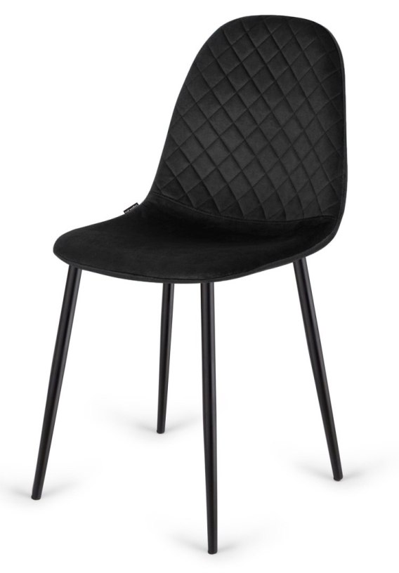 Nowoczesne, solidne i wygodne krzesło do salonu, kuchni, jadalni. Tapicerowane czarną pikowaną tkaniną typu welur. Czarne metalowe nogi.