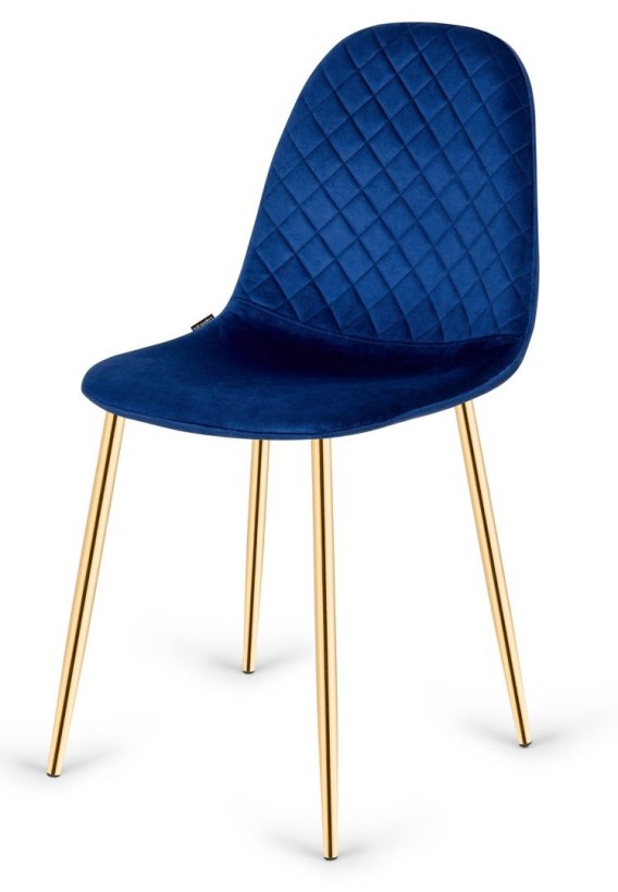 Nowoczesne, solidne i wygodne krzesło do salonu, kuchni, jadalni. Tapicerowane niebieską pikowaną tkaniną typu welur. Złote metalowe nogi.