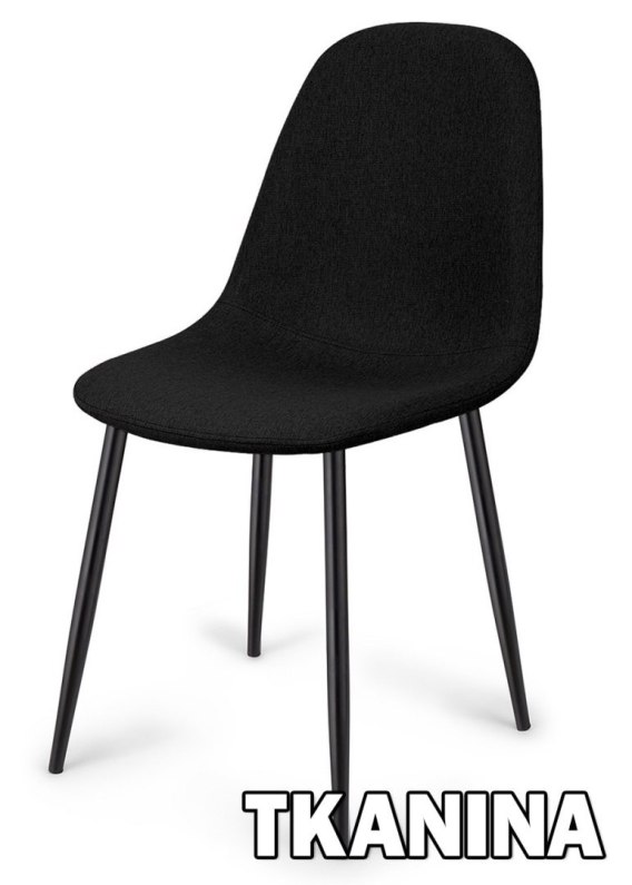 Nowoczesne, solidne i wygodne krzesło do salonu, kuchni, jadalni. Model GIULIA, Marki Lugano. Tapicerowane tkaniną w kolorze czarnym. Czarne metalowe nogi.
