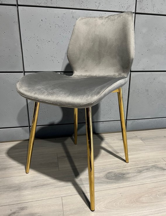Nowoczesne, solidne i wygodne krzesło do salonu, kuchni, jadalni. Tapicerowane tkaniną welur w kolorze szarym. Nogi złote.