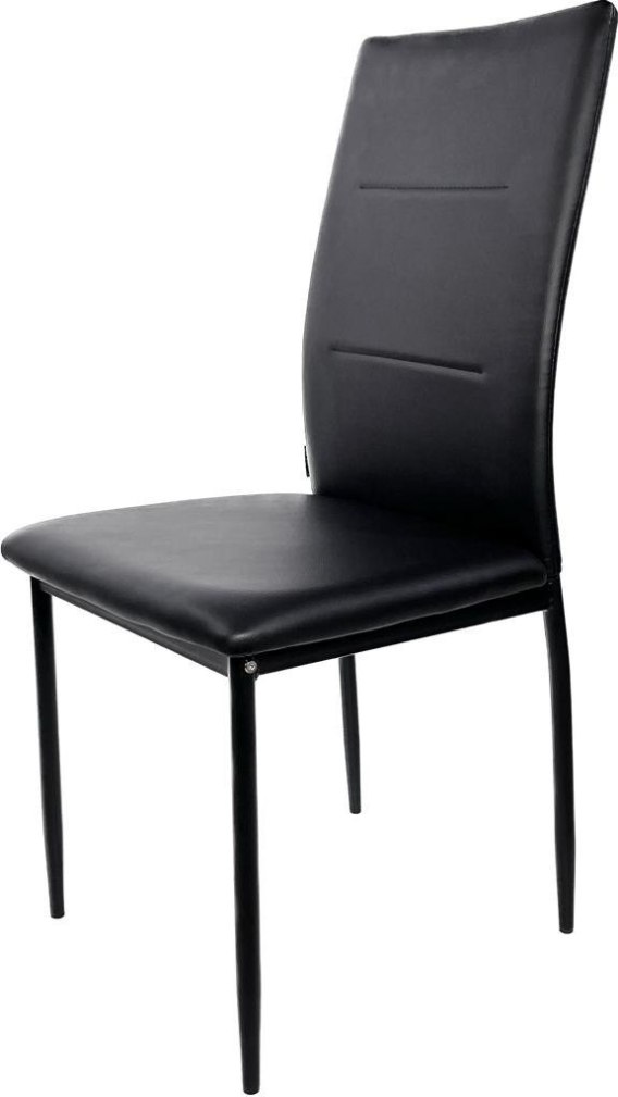 Nowoczesne, solidne i wygodne krzesło do salonu, kuchni, jadalni. Tapicerowane eko skórą w kolorze czarnym. Czarne metalowe nogi.