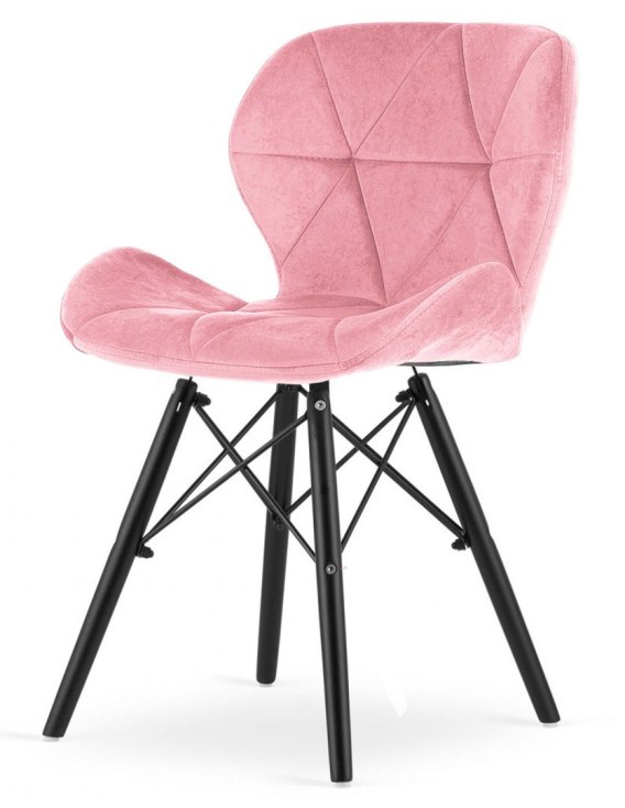 Krzesło skandynawskie pikowane, tapicerowane wysokiej jakości tkaniną welur w kolorze Różowym . Idealne do jadalni, kuchni, salonu. Lakierowane nogi z drewna bukowego czarne, wzmocnione metalowym stelażem. Producent LUGANO.